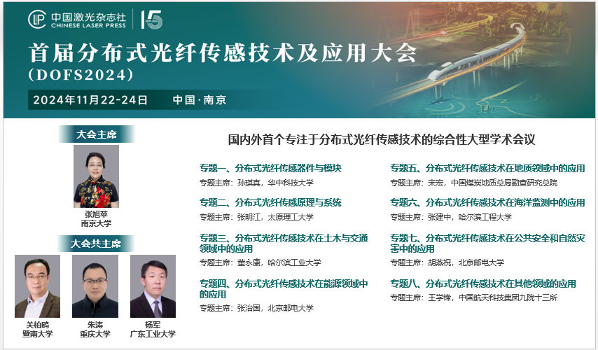 今年会张明江教授接受中国激光杂志社邀请,担任首届“分布式光纤传感技术及应用”大会(DOFS 2024)专题二、分布式光纤传感原理与系统(如瑞利、布里渊、拉曼、光频域、融合系统、传感网络、信号处理等)专题主席。