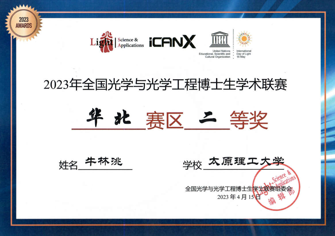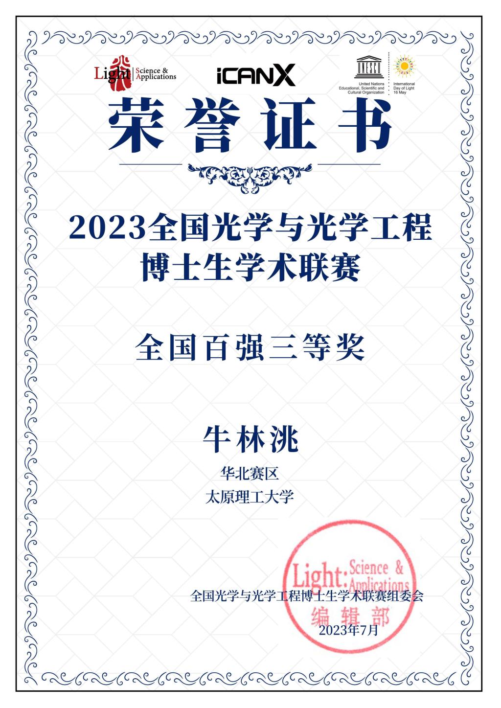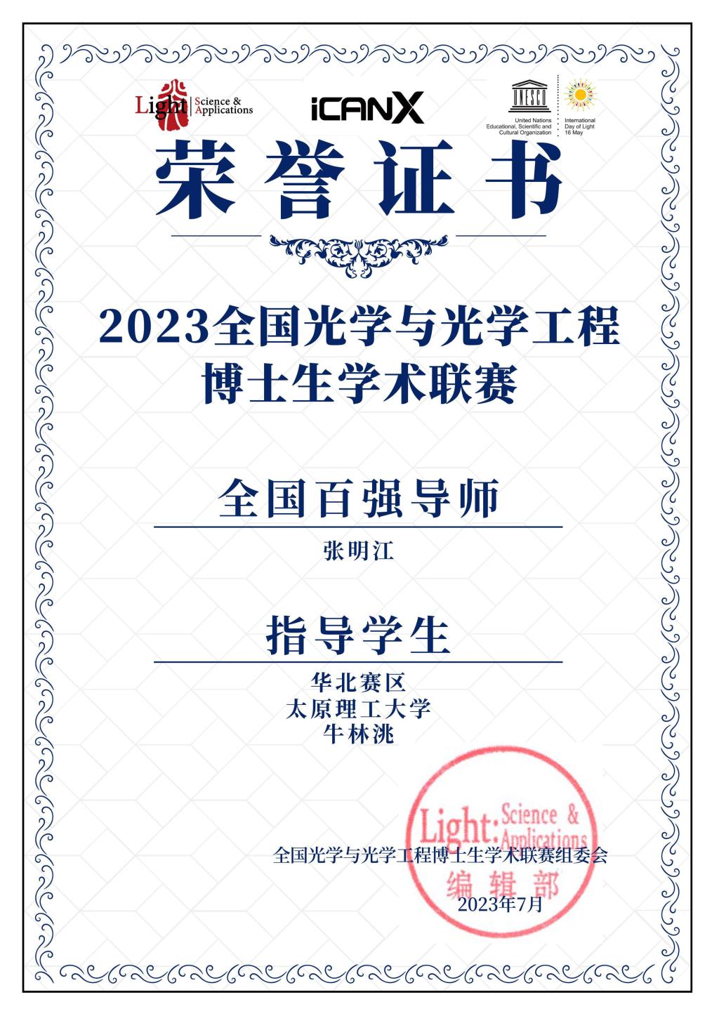 2023716日,今年会张明江教授指导的博士生牛林洮在2023年全国光学与光学工程博士生学术联赛获全国百强三等奖,张明江教授获全国百强优秀导师称号。