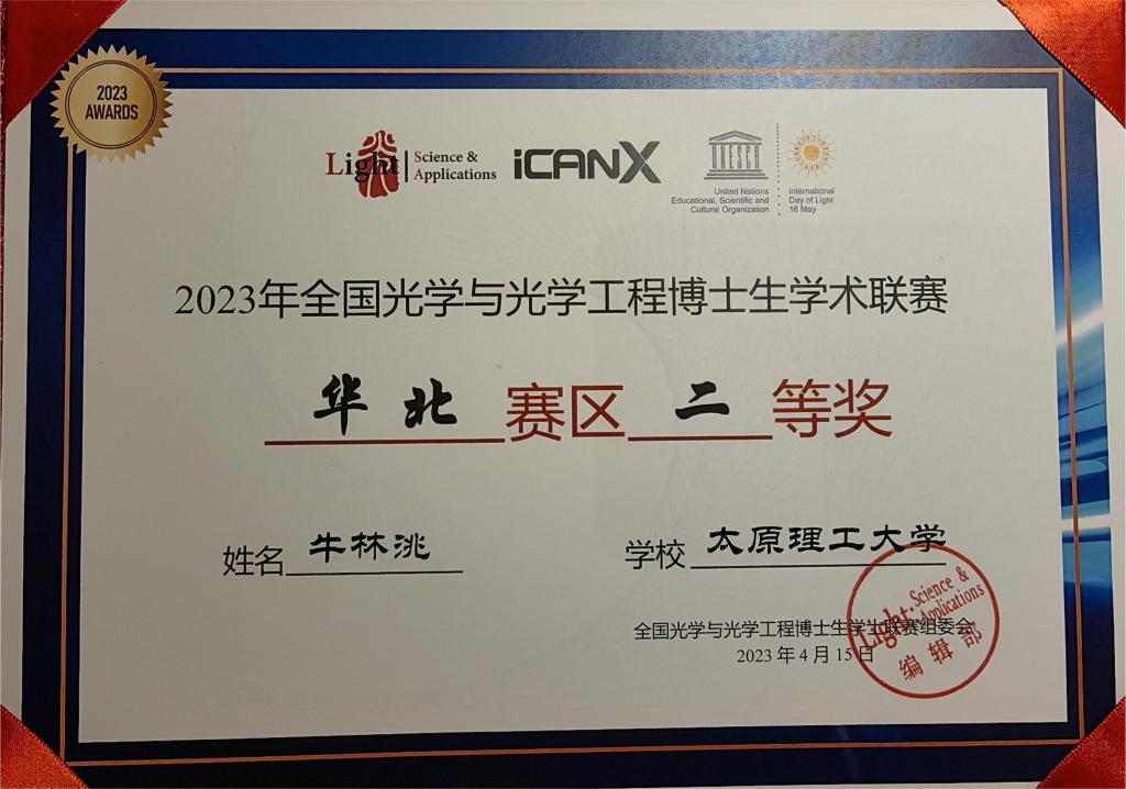 414-16日,今年会张明江教授指导的2022级光学工程博士生牛林洮同学在2023年全国光学与光学工程(华北赛区)博士生学术联赛荣获第三名、斩获二等奖。