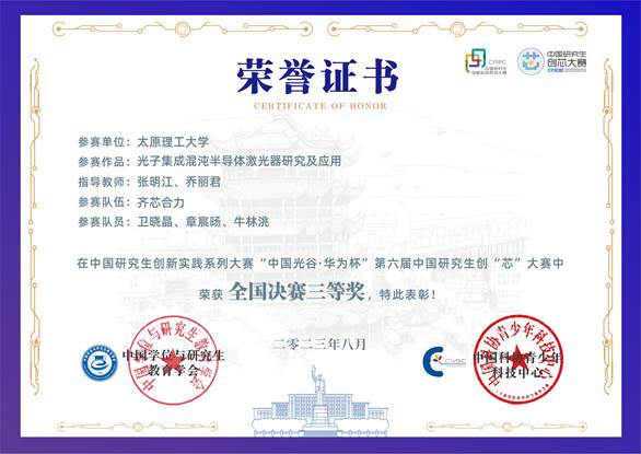 本届大赛中,来自不同高校的889支队伍经过紧张的初赛评审,共有171支队伍晋级总决赛。博士三年级研究生卫晓晶和硕士二年级研究生章宸旸、博士一年级研究生牛林洮组成的“齐芯合力”队伍在张明江教授和乔丽君副教授的悉心指导下,参赛作品“光子集成混沌半导体激光器研究及应用”最终进入全国总决赛,并获得三等奖。