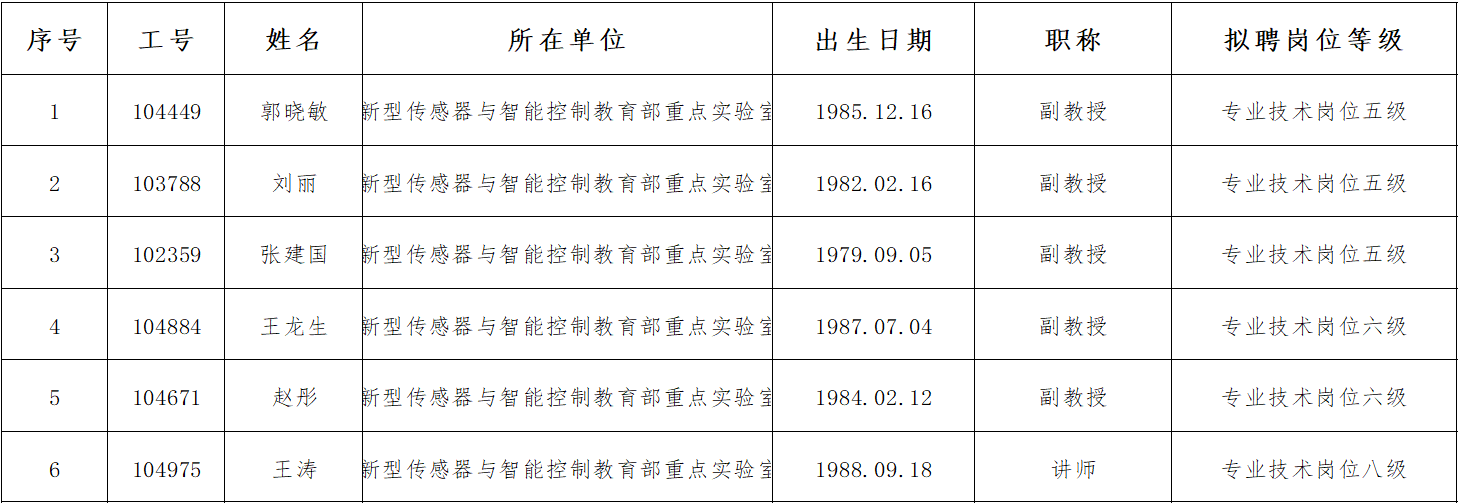 2024年11月11日,根据《新型传感器与智能控制教育部重点实验室专业技术教师四级及以下岗位聘用实施方案及办法》,组长杨毅彪教授组织评议组成员在今年会明向校区南楼304会议室开展教师岗位的分级评审工作,现将结果公示如下: